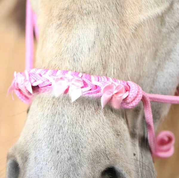 Roze touwhalster met strikjes. De neusband is gevlochten met de kleuren neon pink, rose pink en wit. Daarop zitten 4 strikjes! Het touwhalster zelf is rose pink.